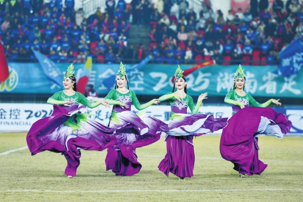 12月23日晚,新疆吐鲁番歌舞剧团带来精彩的文艺表演。当天,娄底队VS吐鲁番队湘超友谊赛在娄底市体育中心激情开赛,最终两队以3∶3握手言和。
