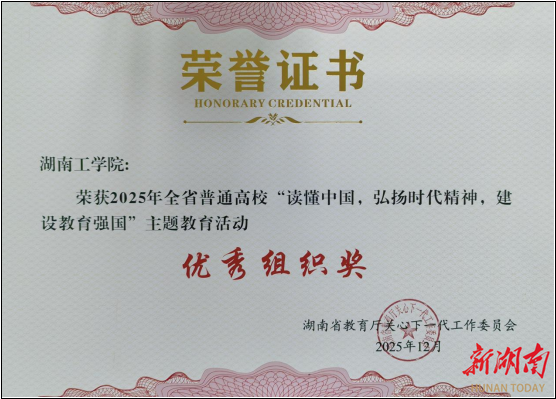 湖南日报·新湖南客户端12月25日讯(通讯员 彭广 李琪)近日,中共湖南省委教育工委公布了《关于2025年全省普通高校“读懂中国”主题教育活动优秀组织奖和作品奖评审结果的通知》,湖南工学院获评优秀组织奖,少数民族预科教育部杨静怡撰写的“追光者”、语言与文化学院初帅羽撰写的“回溯旧时光 展望新征程”、电气与信息工程学院肖振煜撰写的“墨香暖潇湘”获征文二等奖,智能制造与机械工程学院唐宇婷撰写的“读懂中国:从一位教授的生命足迹里”获征文三等奖,电气与信息工程学院阿燕等拍摄的视频“青蓝相继:五老精神的育人密码”获微视频二等奖。