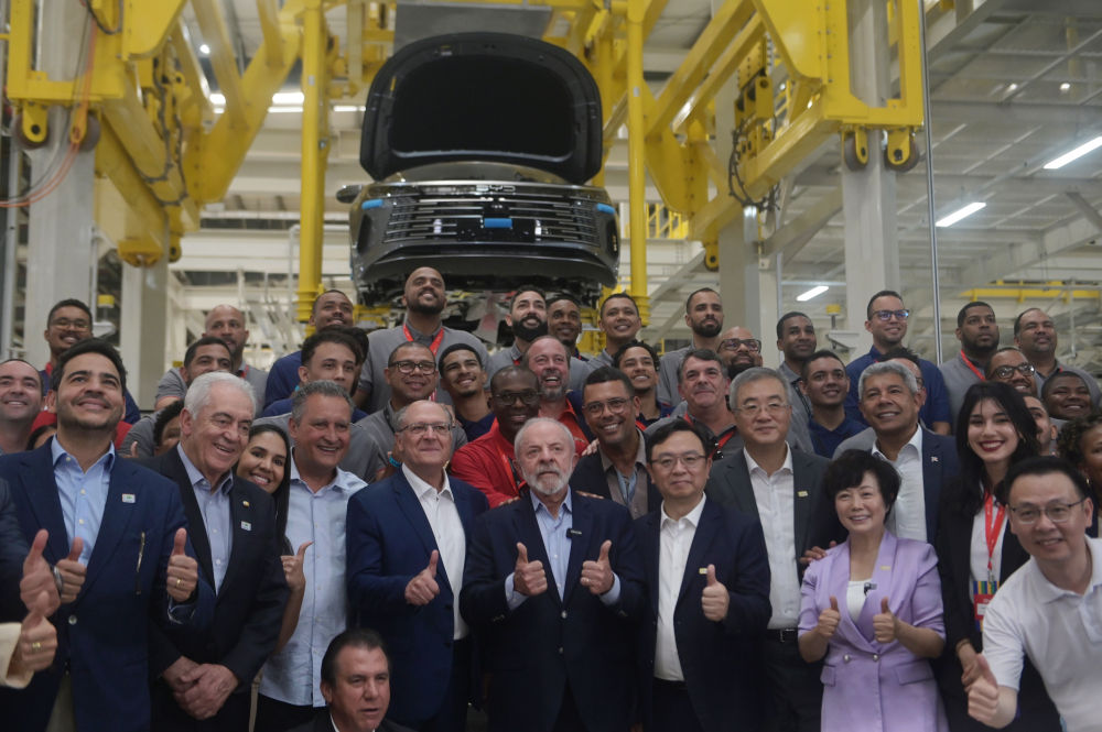 ↑2025年10月9日,巴西总统卢拉(中)出席比亚迪第1400万辆新能源汽车下线庆祝仪式。