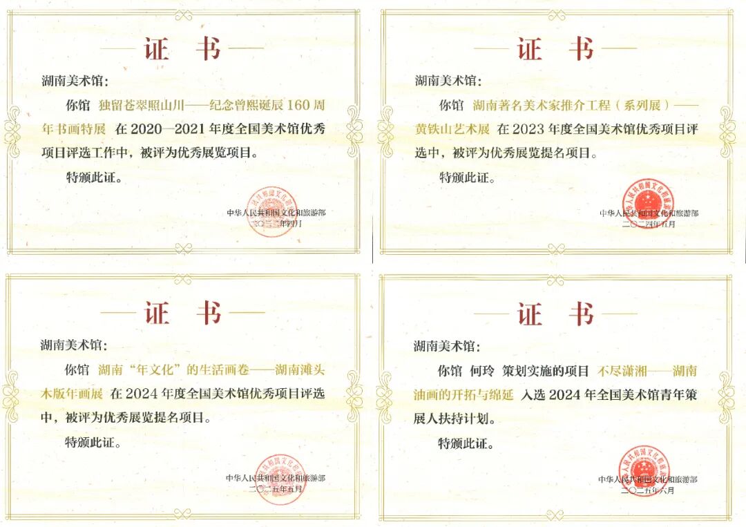 精品展览树品牌,立足湖湘显特色。五年来策划举办展览89场,服务观众超300万人次,打造了一批有影响力的展览品牌。自主策划的“湖南著名美术家推介工程”推出陈白一等10位名家展览及相关活动,其中“黄铁山艺术展”获“2023年度全国美术馆优秀展览提名项目”;“独留苍翠照山川——纪念曾熙诞辰160周年书画特展”获“2020—2021年度全国美术馆优秀展览项目”;“如此漫长・如此浓郁——黄永玉新作展”收获学界与公众双重认可。积极探索“两个融合”机制,科技赋能文化破圈,“客中月光照家山——北京画院藏齐白石精品展”创新运用展品、文献、公教、体验、新媒体、雕塑“六位一体”模式,接待观众超60万人次,入选“2023全国美术馆100大年度热门展览”;两届“湖南公共艺术季”开创了湖南公共艺术新纪元。聚焦重大主题,举办“湖湘百年美术之路——周令钊抗战主题作品展”等展览,传承红色基因。创新推出湖南美术现象研究展、民间美术系列展,“‘年文化’的生活画卷——湖南滩头木版年画展”获“2024年度全国美术馆优秀展览提名项目”。引进“‘在时间里流淌——百年欧洲绘画的多重实践’中法建交60周年特展”等交流展,赢得良好社会反响。