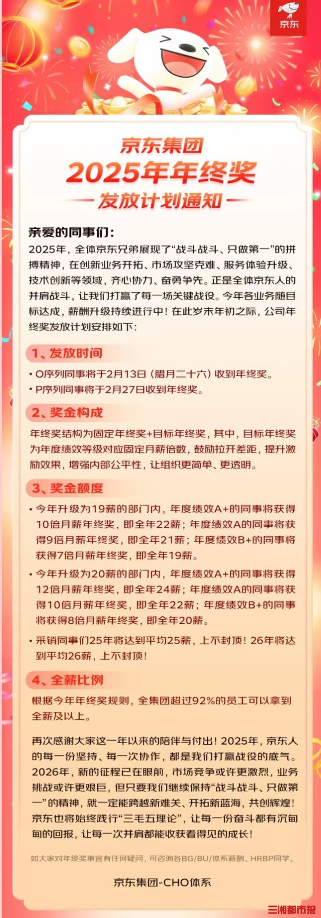 三湘都市报·新湖南客户端12月25日讯(全媒体记者 仝若楠)12月25日,京东发布了2025年终奖公告,京东全集团92%的员工拿满甚至拿到超额年终奖,年终奖总投入同比增幅超过70%。
