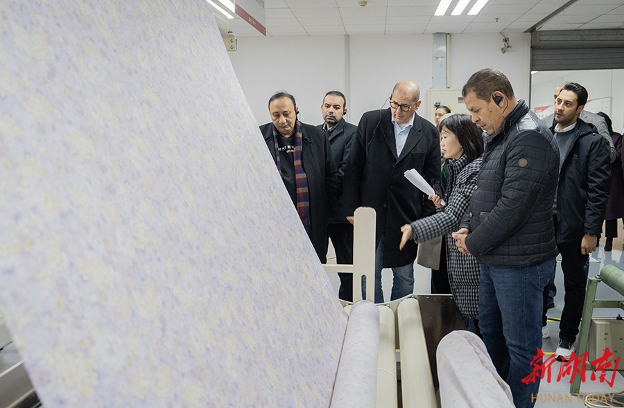 12月24日,长沙市梦洁麓谷工业园,考察团在参观梦洁产品生产线。当天,受中共中央对外联络部邀请访湘的埃及工商界人士考察团走进梦洁麓谷工业园,当来自尼罗河畔的顶级长绒棉出现在眼前时,代表团成员们眼前一亮——那是故乡的骄傲,也是国际供应链上的“湖南故事”。湖南日报全媒体记者 李健 摄