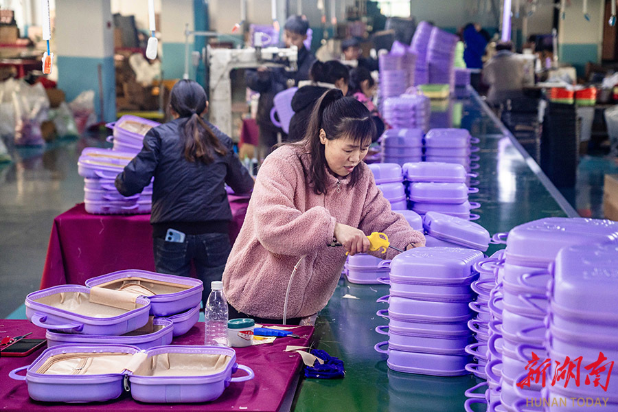 12月25日,吉首市经开区箱包服饰产业园,恒森箱包有限公司的工人在生产车间加紧作业。临近年末,该市多家企业全力赶制订单,确保完成全年生产任务。 彭璟 摄(湖南图片库)