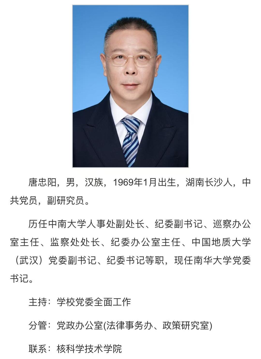 湖南日报·新湖南客户端12月26日讯(记者 周帙恒)据南华大学官方网站“现任领导”一栏显示,唐忠阳任南华大学党委书记,主持学校党委全面工作。