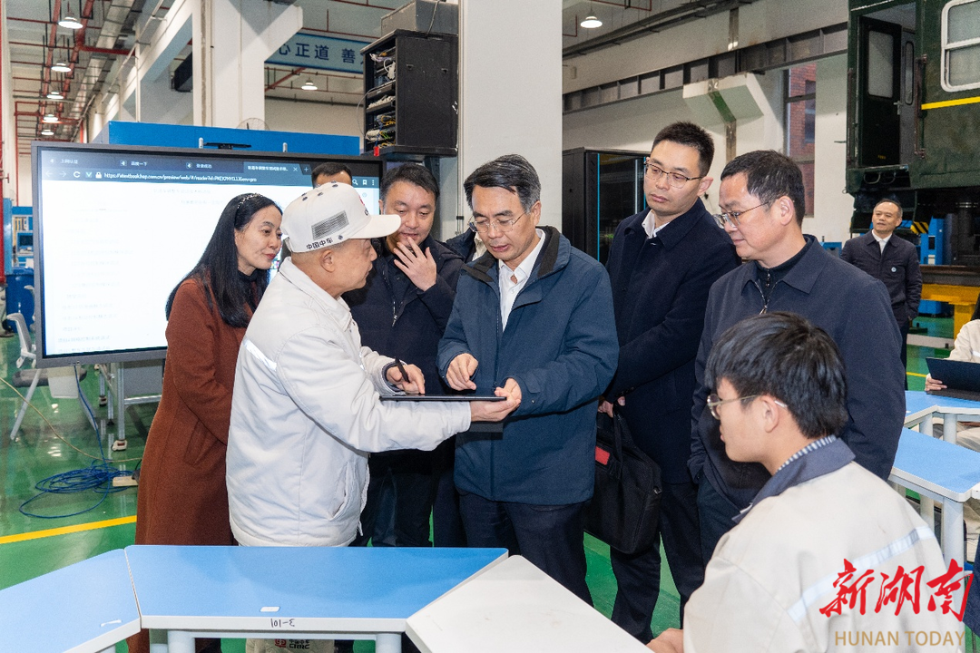 在国家轨道交通装备行业产教融合共同体株洲实训基地,王铵重点考察了中车株机、中车株洲所、中车株洲电机、时代新材、时代电动、中车株辆等联合学校打造的涵盖轨道交通装备智能制造主体产业、配套产业、支撑产业的区域共享型轨道交通实训基地。企业提供的先进实训设备为基地建设奠定了坚实基础,其中中车株机捐赠的电传动六轴干线客运电力机车(“大红枣”)成为校企开展低压实验的重要载体。在轨道交通智能运维中心教学区,全国“五一劳动奖章”获得者、中车株机谢光明技能大师正在用《轨道车辆整车调试技术》数字教材为学生现场教学。王铵亲切与师生交流,对于填补了行业空白的该数字教材给予充分肯定。