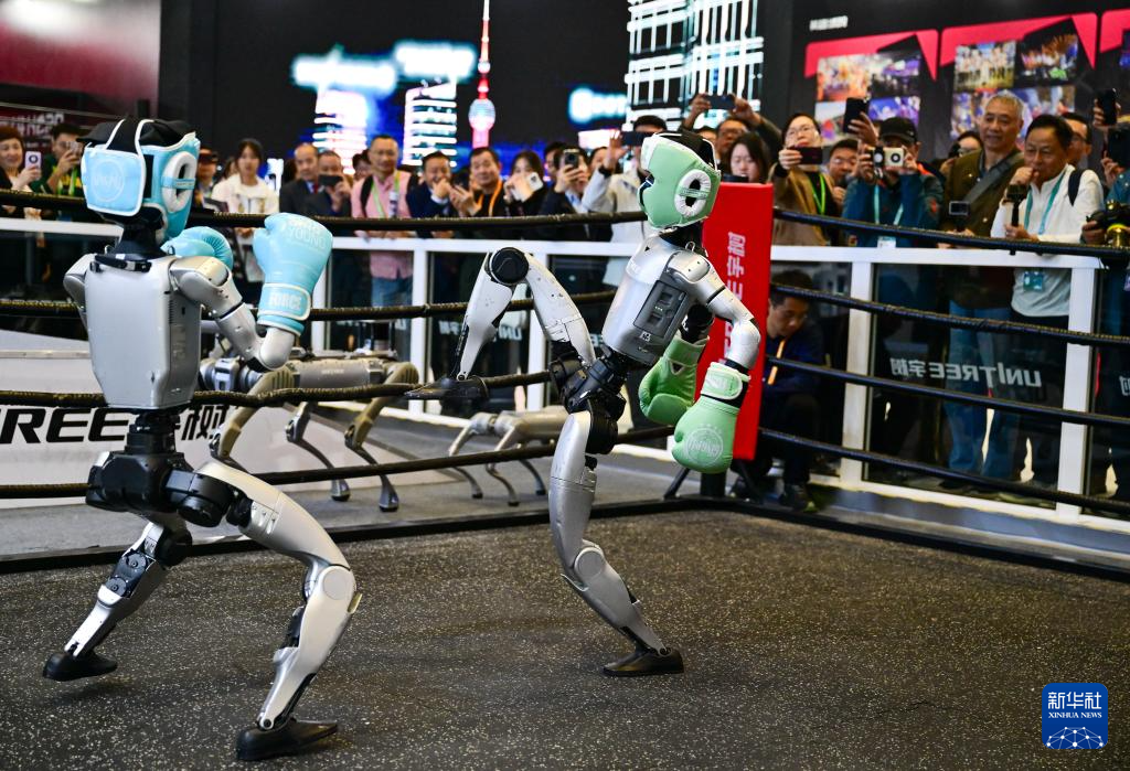 2025年11月6日,在第八届进博会宇树科技展台,人形机器人进行格斗表演。