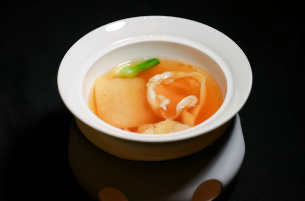 A conceptual progression of radish through time accompanied the dish: Zhangzhou white radish, gently braised in chicken stock to represent youth; crisp, pickled yellow radish, symbolizing maturity; and aged, dried radish, distilled into the essence of the stuffing, evoking old age.