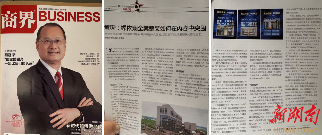 湖南日报·新湖南客户端12月26日讯(通讯员 赵三星)近日,家居行业知名品牌蝶依斓凭借其在全案整装领域的创新模式与高质量发展成果,获得全球发行量和影响力最大的中文商业财经期刊、商业权威媒体《商界》杂志的专题采访。