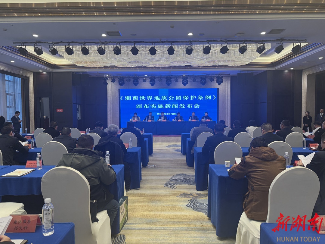 湖南日报·新湖南客户端12月26日讯(全媒体记者 李孟河 通讯员 晏小明 胡令雄)今天,湘西土家族苗族自治州召开《湘西世界地质公园保护条例》(以下简称《条例》)颁布实施新闻发布会。《条例》将于2026年1月1日起施行。