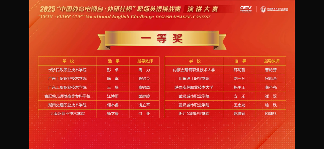 近日,长沙民政职院外语学院商务英语2334班学生彭卓在“中国教育电视台·外研社杯”职场英语挑战赛演讲大赛全国决赛的舞台上,荣获全国一等奖!