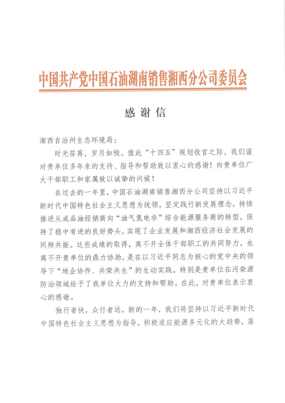 新湖南客户端12月26日讯(通讯员 张洋)近日,湘西土家族苗族自治州生态环境局收到一封来自中石油湘西分公司的感谢信,对该局在污染源防治的帮扶指导表示最真挚的谢意。
