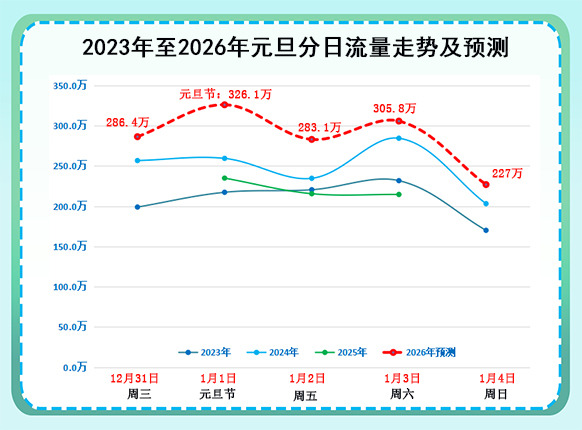 路网压力将集中在3个短时高峰:节前出行(12月31日18:00-20:00)、假期首日出城(1月1日9:00-11:00)、假期末日下午返程(1月3日14:00-16:00)。预计高峰持续时间较短,车流集聚与消散速度较快。