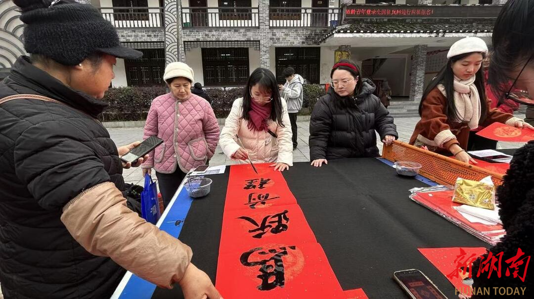 理论宣讲区里,党的创新理论被转化为通俗易懂的“家常话”,《湘西土家族苗族自治州文明行为促进条例》、“扫黄打非”、全民国防教育宣传图文并茂,让乡亲们听得进、看得懂、记得住;龙山县文联书法家们挥毫泼墨,红纸翻飞间,一幅幅饱含祝福的春联和书法作品被争相领取,拿到手的乡亲们笑得合不拢嘴;县新华书店的免费赠书、优惠售书摊位前人头攒动,孩子们捧着新书爱不释手,让书香浸润群众心田。