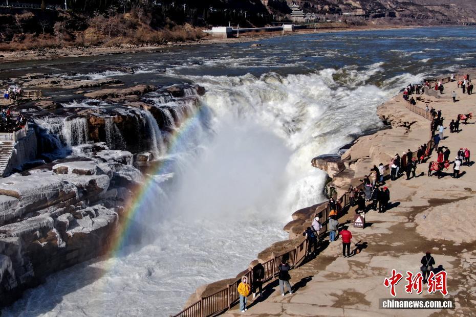 近日,游客在山西吉县黄河壶口瀑布游览观瀑。近日,受持续降温天气影响,位于山西吉县和陕西宜川县交界的黄河壶口瀑布出现冰挂景观,吸引游客参观。(无人机照片)中新社发 吕桂明 摄