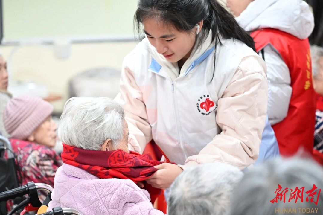 在郴州夕乐苑苏仙区康养中心,郴州福彩志愿者和学生代表们为老人们带来了日常所需的毛巾、棉拖等物资。在元旦节来临之际,学生志愿者们还为老人带上喜庆的福彩红围巾,老人们脸上洋溢着幸福的笑容。郴州职业技术学院学生刘亚翔感慨颇深:“今天我来到现场,给奶奶送围巾握住他们的双手,我感受到老人家也需要温暖。”