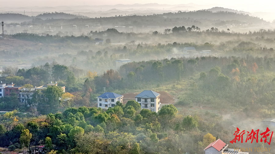 12月26日清晨,常宁市曲潭街道办事处义田村,朝霞中的田园村落与彩林河流相映成趣,在晨雾笼罩下宛如一幅水墨丹青。 刘东华 摄(湖南图片库)