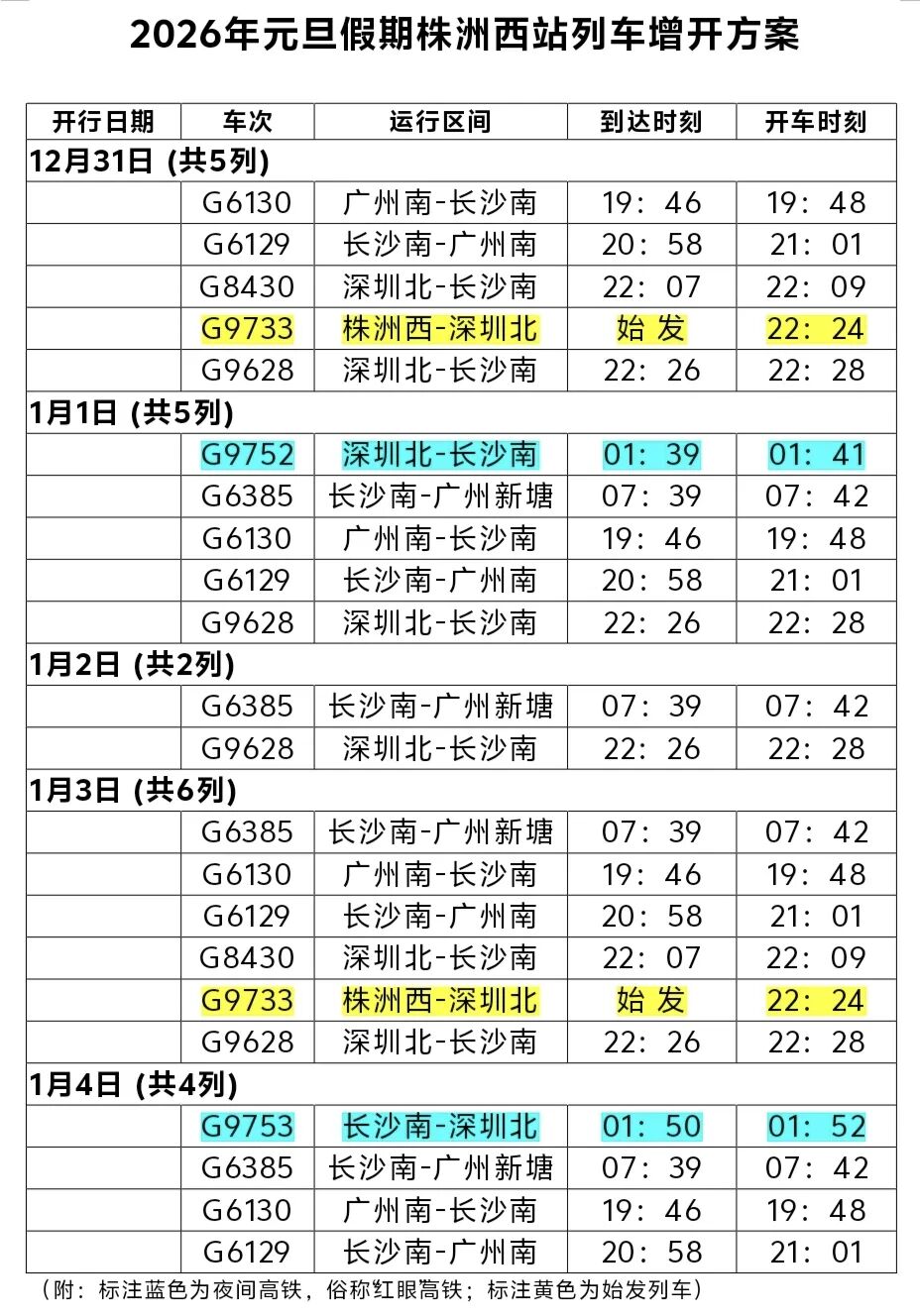 特别提醒:为应对假期客流高峰,株洲西站于节前、节后分别加开一趟夜间高铁(红眼高铁):1月1日G9752次(01:39到达/01:41发车),1月4日G9753次(01:50到达/01:52出发)。由于铁路运营采用24小时制,有乘坐以上两趟列车的旅客或接送亲友的市民注意了,两趟列车实际运行时间是12月31日和1月3日当晚的下半夜,切莫1日和4日晚上到站哦,否则整整相差24小时,势必耽误行程了。
