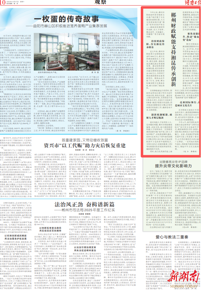 大力支持文旅融合创新,专项扶持打造郴州首台沉浸式文旅演艺《湘遇·湘昆》。该剧自今年7月首演以来场场爆满,累计吸引观众1.2万人次,成功入选“2025中国旅游产业影响力案例”。积极支持数字化、年轻化表达,助力打造《湘昆版科目三》《牡丹亭》水袖慢镜头等短视频爆款,相关作品全网流量超4000万次,有效推动湘昆从“曲高和寡”走向“破圈出彩”。