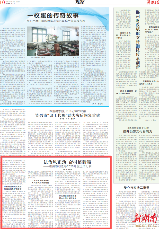 回首2025年,法治郴州的画卷,由一个个具体的改变绘就。它是在行政复议决定书上得到确认的个体权利,是在企业门口减少的行政打扰,是随快递车穿梭在大街小巷的法治读物,也是偏远乡镇司法所里那盏更亮的灯。这些变化无声却有力,共同汇聚成“法治郴风”的强劲势头,推动着这座城市在高质量发展的航道上,奋楫向前,谱写新篇。