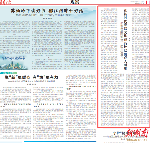 二十届中央纪委四次全会强调,加大以文化人、以文育人力度,制订新时代廉洁文化建设三年行动计划(2025—2027年),推动廉洁文化走进各行各业、千家万户。张家界航空工业职业技术学院立足立德树人根本任务,积极探索新时代廉洁文化的育人目标、思路和方式,让廉洁文化在高校结出育人硕果。