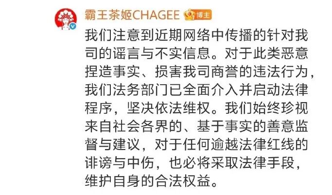 霸王茶姬官博26日下午在评论区回复称:我们注意到近期网络中传播的针对我司的谣言与不实信息。对于此类恶意捏造事实、损害我司商誉的违法行为,我们法务部门已全面介入并启动法律程序,坚决依法维权。我们始终珍视来自社会各界的、基于事实的善意监督与建议,对于任何逾越法律红线的诽谤与中伤,也必将采取法律手段,维护自身的合法权益。