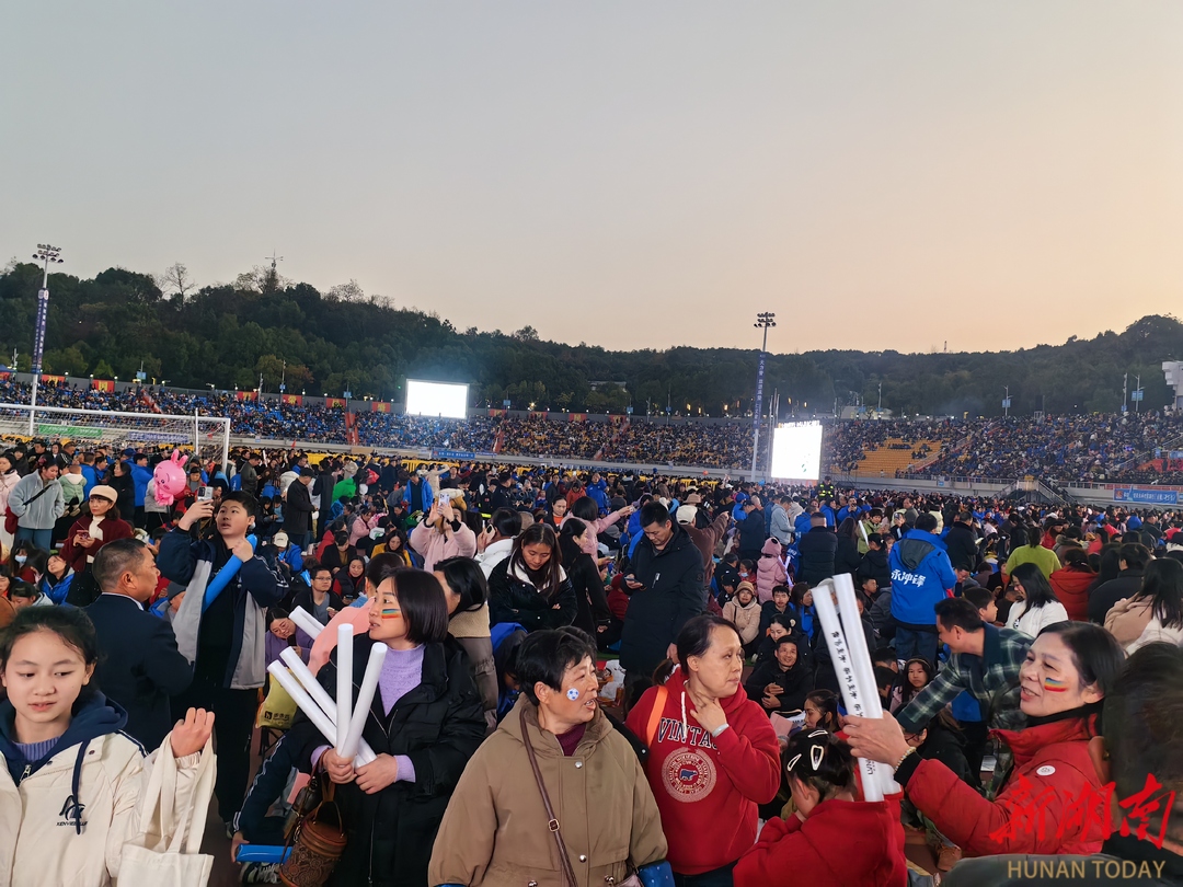 湘超决赛之夜,作为比赛第二现场的永州体育场,涌入数万人,通过大屏幕隔空为永州队加油。(记者 李寒露)
