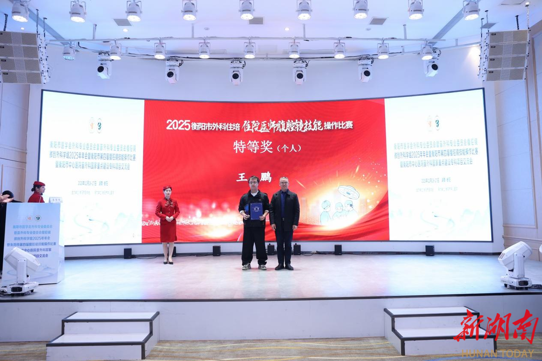 会上还为12月26日举办的“2025年衡阳市外科住培住院医师腹腔镜技能操作比赛”和“2025衡阳市第四届青年医师腹腔镜技能操作比赛”两项大赛中获奖的团队和个人进行了颁奖。