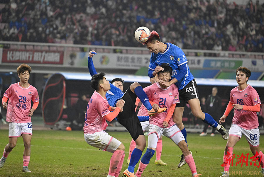 12月27日晚,下半场第58分钟,永州队借角球战术传中后,球员在禁区乱战最终永州队完成破门,目前比分1:0,永州队暂时领先。当晚,2025湖南省足球联赛决赛在长沙贺龙体育场打响,永州队(蓝)与常德队展开终极较量。 湖南日报全媒体记者 郭立亮 摄