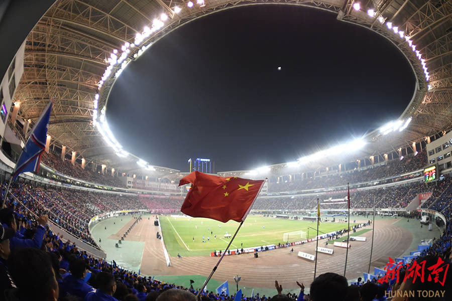 12月27日晚,下半场比赛火热进行中,贺龙体育场现场观赛人数有43695人。当晚,2025湖南省足球联赛决赛在长沙贺龙体育场打响,永州队(蓝)与常德队展开终极较量。 湖南日报全媒体记者 郭立亮 摄