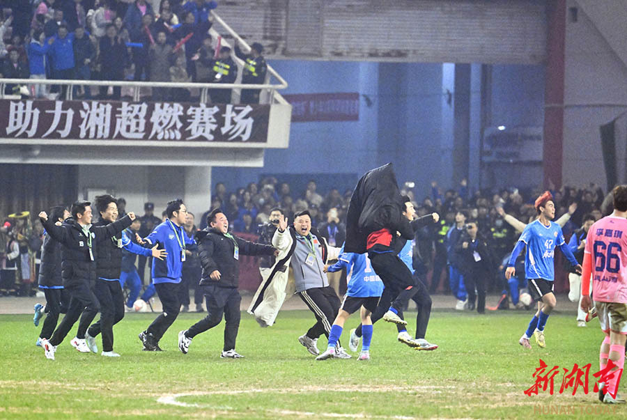 12月27日晚,夺冠后,永州队球员和教练在领奖台上捧起奖杯,欢呼庆祝。当晚,2025湖南省足球联赛决赛在长沙贺龙体育场打响,永州队(蓝)与常德队展开终极较量,最终永州队以1:0战胜常德队。 湖南日报全媒体记者 辜鹏博 摄