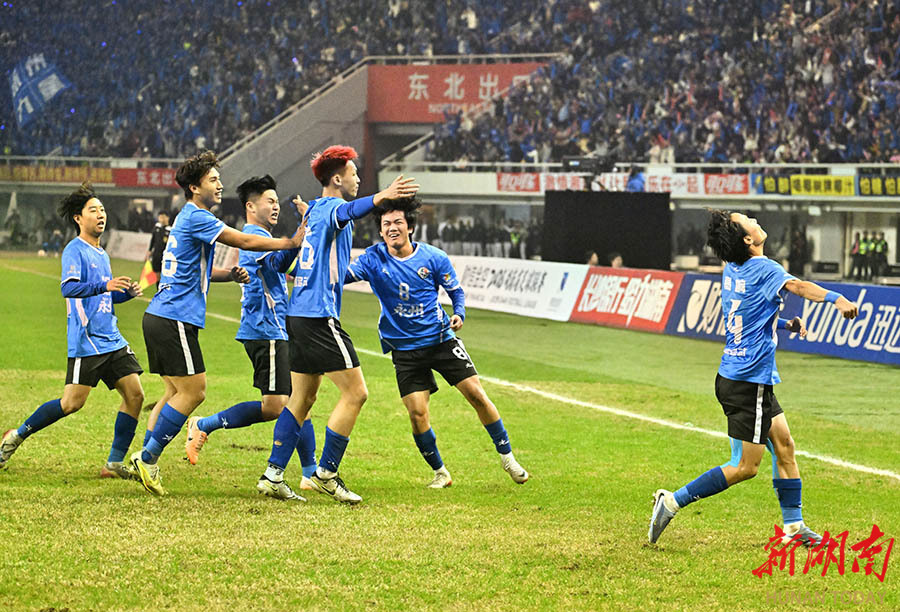 12月27日晚,永州队球员进球后在欢呼庆祝。当晚,2025湖南省足球联赛决赛在长沙贺龙体育场打响,永州队(蓝)与常德队展开终极较量。 湖南日报全媒体记者 郭立亮 摄