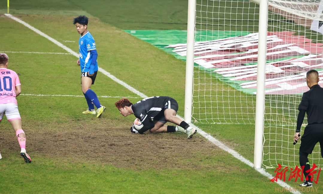 图为常德守门员门前化险。 “湘超”的赛场,映照着每一个平凡人的“赛场”。这个属于我们自己的足球舞台,当皮球划出完美弧线直挂网窝,点燃了平淡日常里的激情,用凡人的拼搏,定义了热爱的模样。这是对纯粹的向往、对热血的本能渴望,是对“不到最后一刻永不放弃”的深深认同。