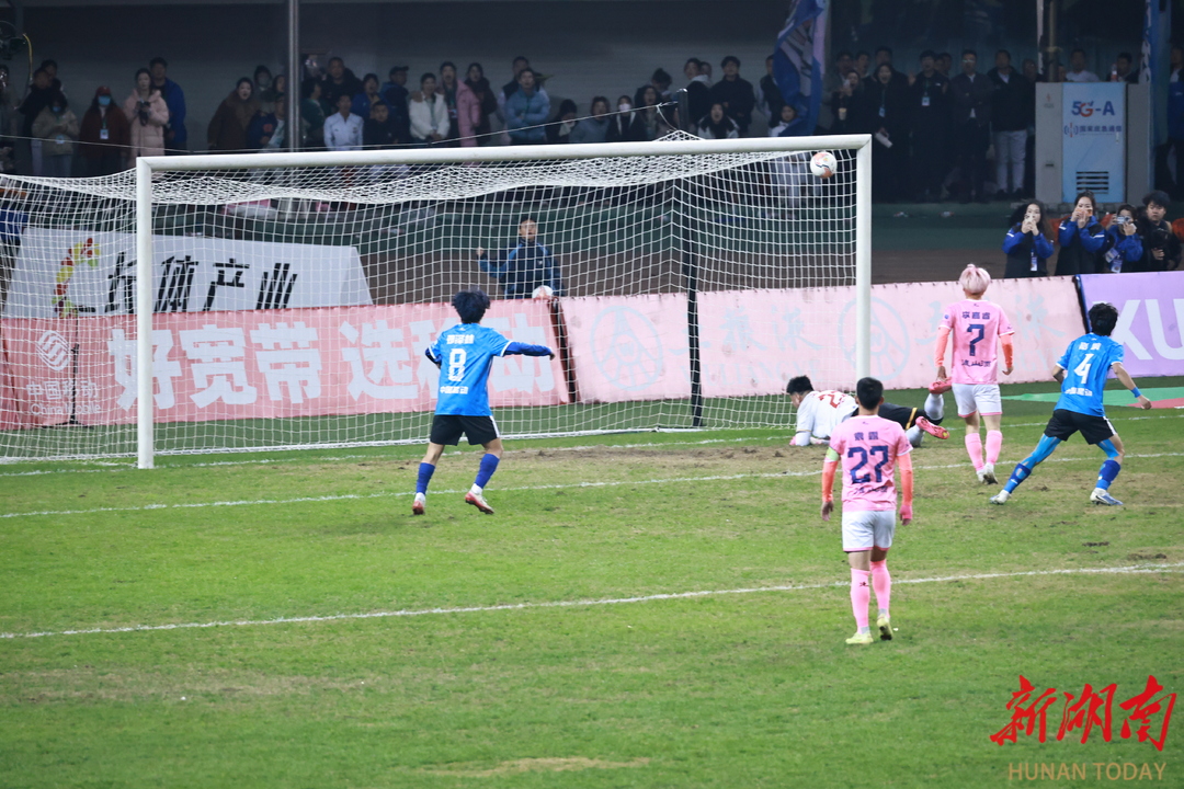 图为下半场第58分钟,永州队凭借46号谷文杰的头球破门。 12月27日晚,随着一声终场哨声划破长沙贺龙体育场夜空,永州队以1∶0比分击败常德队,夺得2025年“湘超”冠军。4个多月来,90多场比赛的激烈争夺、100多个昼夜的激情燃烧、全省14个市州的魂牵梦萦,在这一刻画上了圆满的句号。