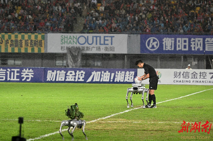 10月18日晚,衡阳市体育中心,由衡阳本土研发的智能机器狗作为“开球嘉宾”携比赛用球入场,成为赛前一大亮点。