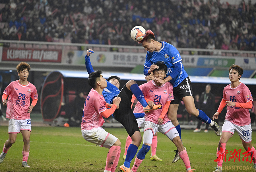 12月27日晚,永州队球员谷文杰头球破门瞬间。当晚,永州队以1比0战胜常德队,获得2025湘超联赛冠军。