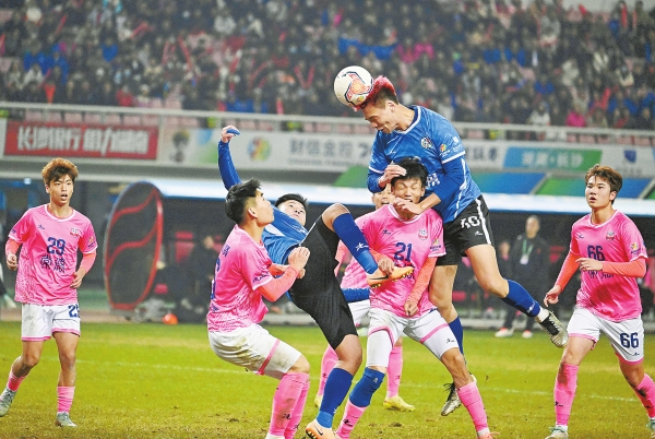 12月27日晚,永州队球员谷文杰头球破门瞬间。当晚,永州队以1比0战胜常德队,获得2025湘超联赛冠军。