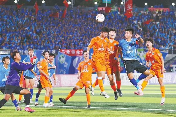 10月12日晚,永州市体育场,邵阳队(橙)球员在比赛中争夺头球。