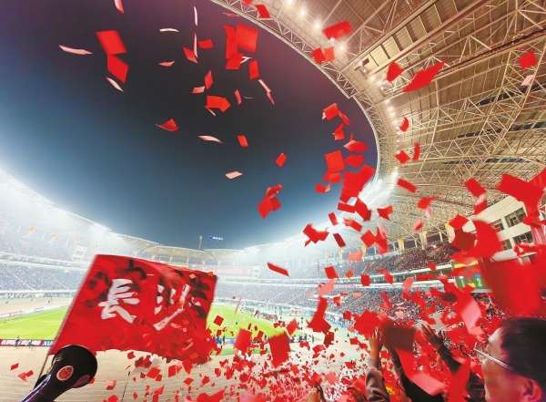 12月20日晚,长沙贺龙体育场,湘超半决赛,球迷在加油呐喊。