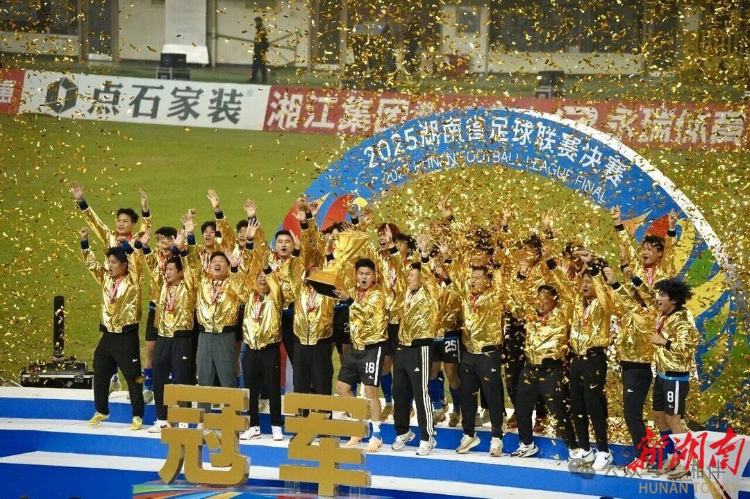12月27日晚,长沙市贺龙体育场,终场哨响起,现场已经成为欢乐的海洋。永州队以1比0战胜常德队夺冠,登上2025湘超联赛的最高领奖台。