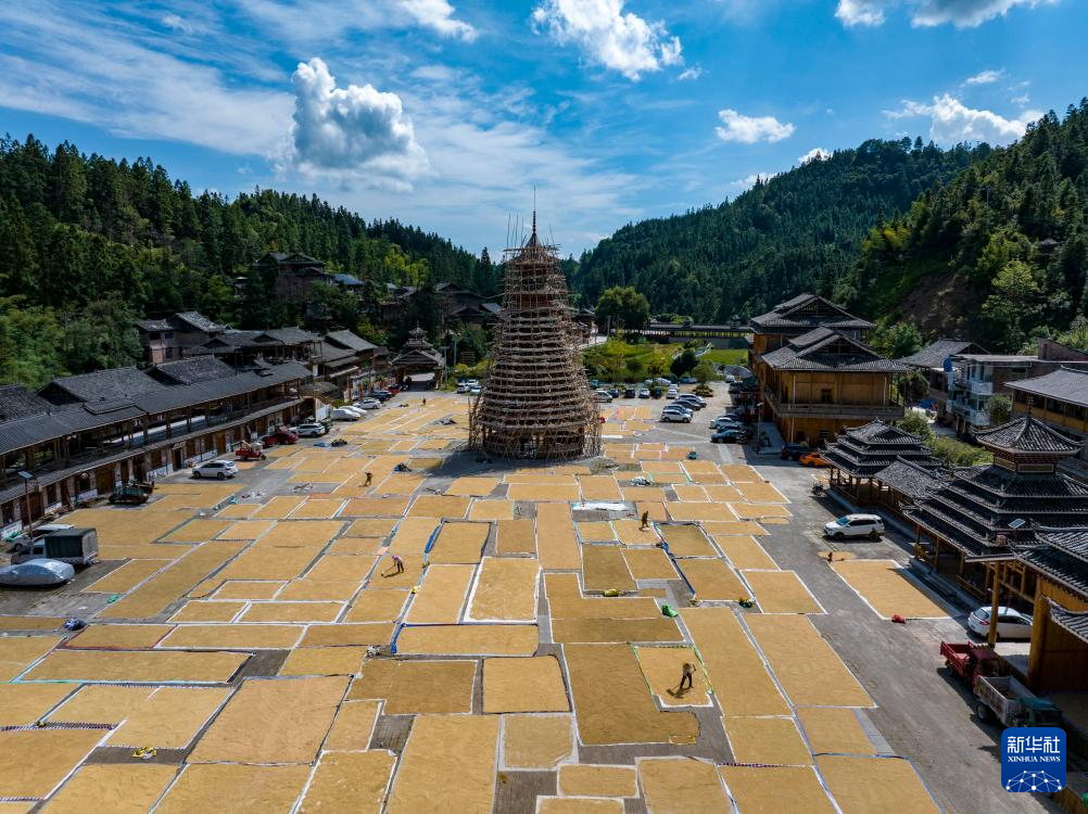 村民在贵州省从江县高增乡小黄村晾晒稻谷(无人机照片,2025年9月15日摄)。