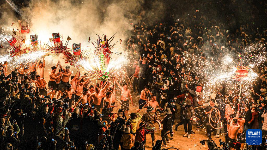 人们在广东省梅州市丰顺县埔寨镇埔南村表演火龙(2024年2月24日摄)。