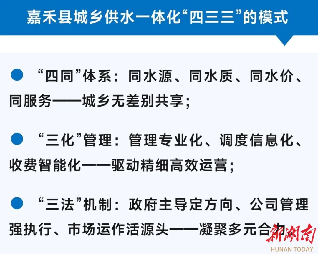 与此同时,嘉禾县探索出了城乡供水一体化的“四三三”的模式。