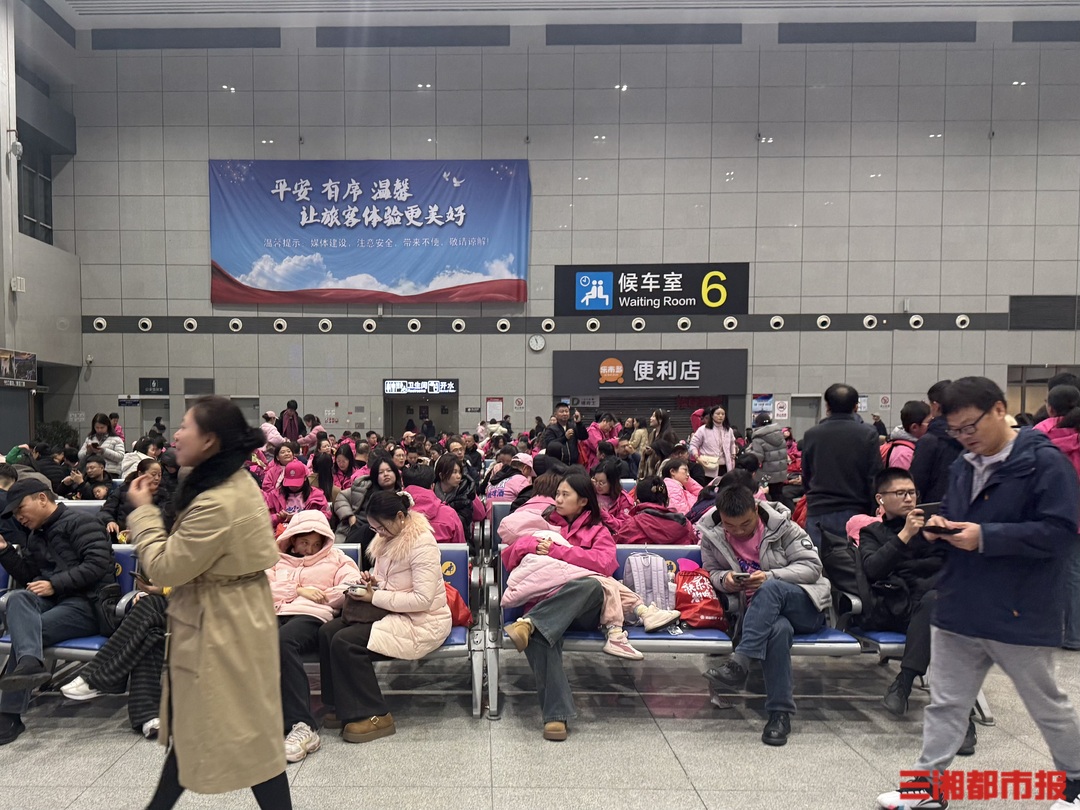 27日23时,长沙锦泰广场站候车大厅已经成为“常德粉”的临时主场,不少身着常德队应援服的球迷们在门口排队等待。记者一眼望去,车站电子屏上滚动显示着三趟专列的检票信息;候车大厅已被粉色“占领”,球迷们虽然刚刚经历比赛的失利,仍挥舞着粉色旗帜,相互安慰、讨论比赛的细节;此外,还有不少铁路工作人员穿梭在人群中,引导乘客有序排队。