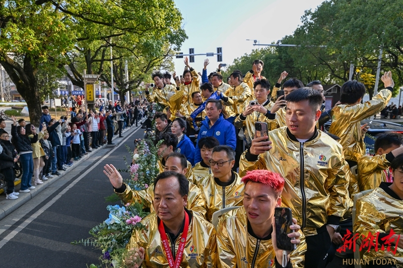 12月28日下午,湘超冠军永州队荣耀凯旋,乘坐花车巡游,受到市民热烈欢迎。当天,永州市举行盛大庆祝活动,欢迎湘超永州队夺冠归来,全城共享胜利喜悦,共同见证荣光时刻。湖南日报全媒体记者 郭立亮 童迪 摄影报道