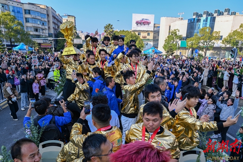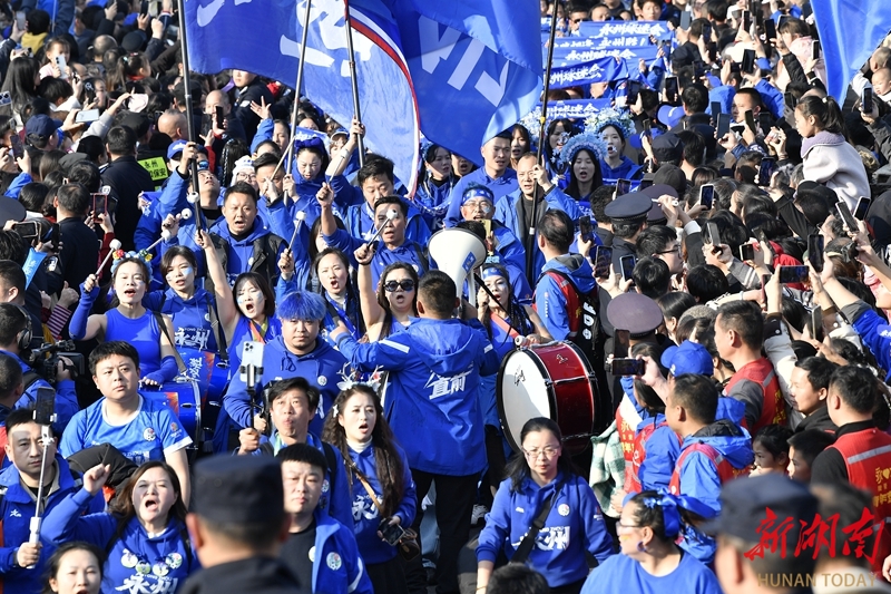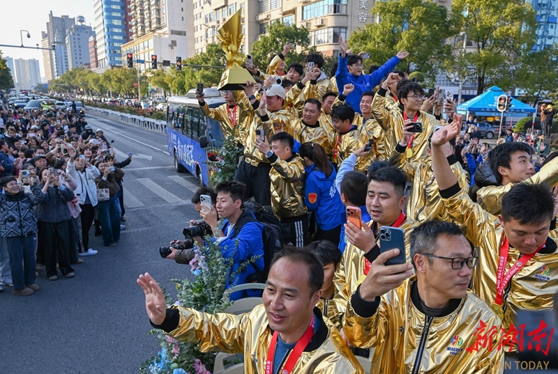 12月28日下午,湘超冠军永州队荣耀凯旋,市民夹道欢迎。当天,永州市举行盛大庆祝活动,欢迎湘超永州队夺冠归来,与全城共享胜利喜悦,共同见证荣光时刻。湖南日报全媒体记者 童迪 郭立亮 摄影报道