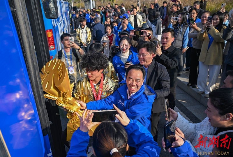 12月28日下午,湘超冠军永州队高举奖杯荣归主场,受到市民热烈欢迎。当天,永州市举行盛大庆祝活动,欢迎湘超永州队夺冠归来,全城共享胜利喜悦,共同见证荣光时刻。湖南日报全媒体记者 郭立亮 童迪 摄影报道