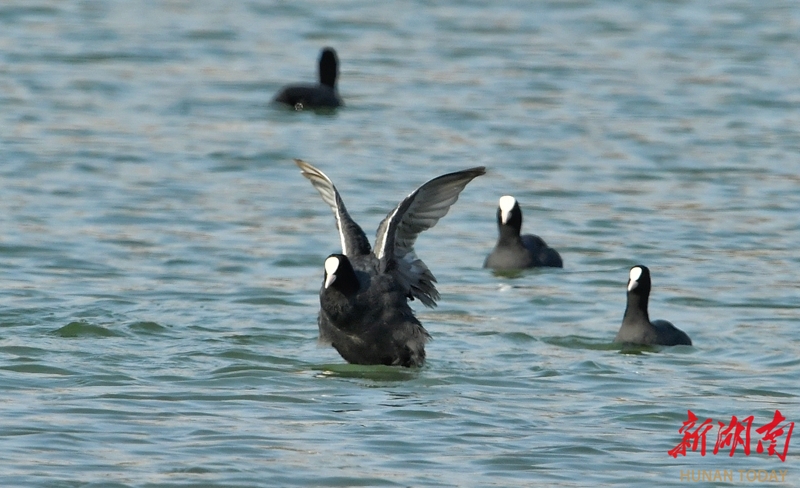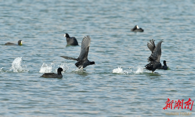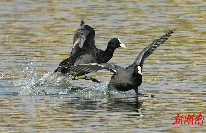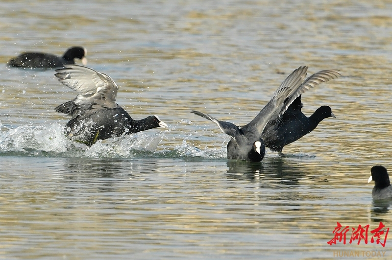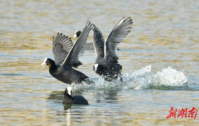 12月28日,长沙洋湖国家湿地公园,白骨顶鸡在水面游弋追逐。白骨顶鸡是鹤形目秧鸡科骨顶属的中型游禽,因头部白色额甲得名,善游泳潜水,栖息于水生植物丰富的湿地,以水生植物、鱼虾及昆虫为食。湖南日报全媒体记者 徐行 摄