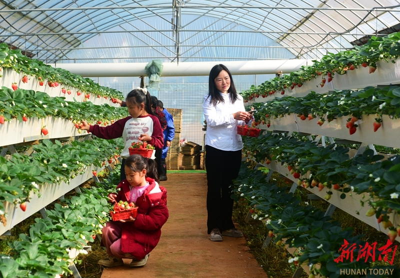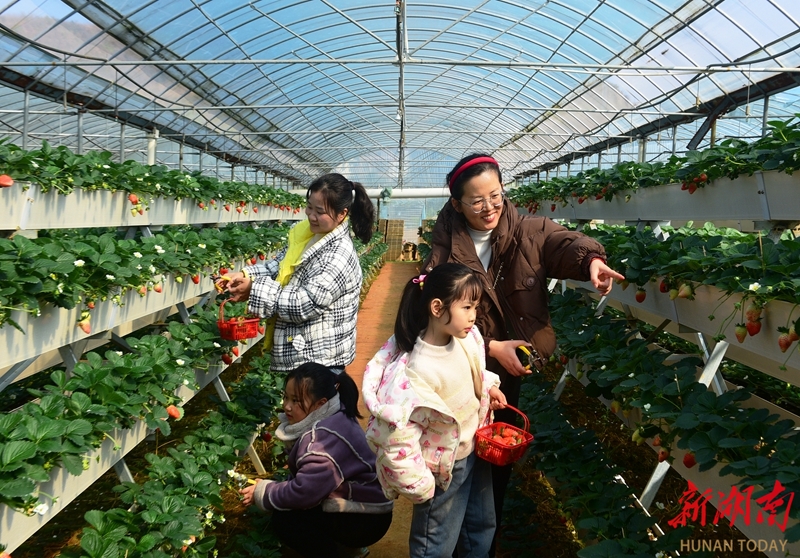 12月28日,蓝山县太平圩镇超拓农业种植有限公司种植的“立体草莓”陆续成熟,吸引众多游客前来体验采摘的乐趣。近年来,该县农业科技部门积极推广“立体栽培”技术,将传统草莓种植升级为大棚立体栽培模式,有效提高土地利用率,为农村农业发展注入新活力。黄春涛 摄(湖南图片库)