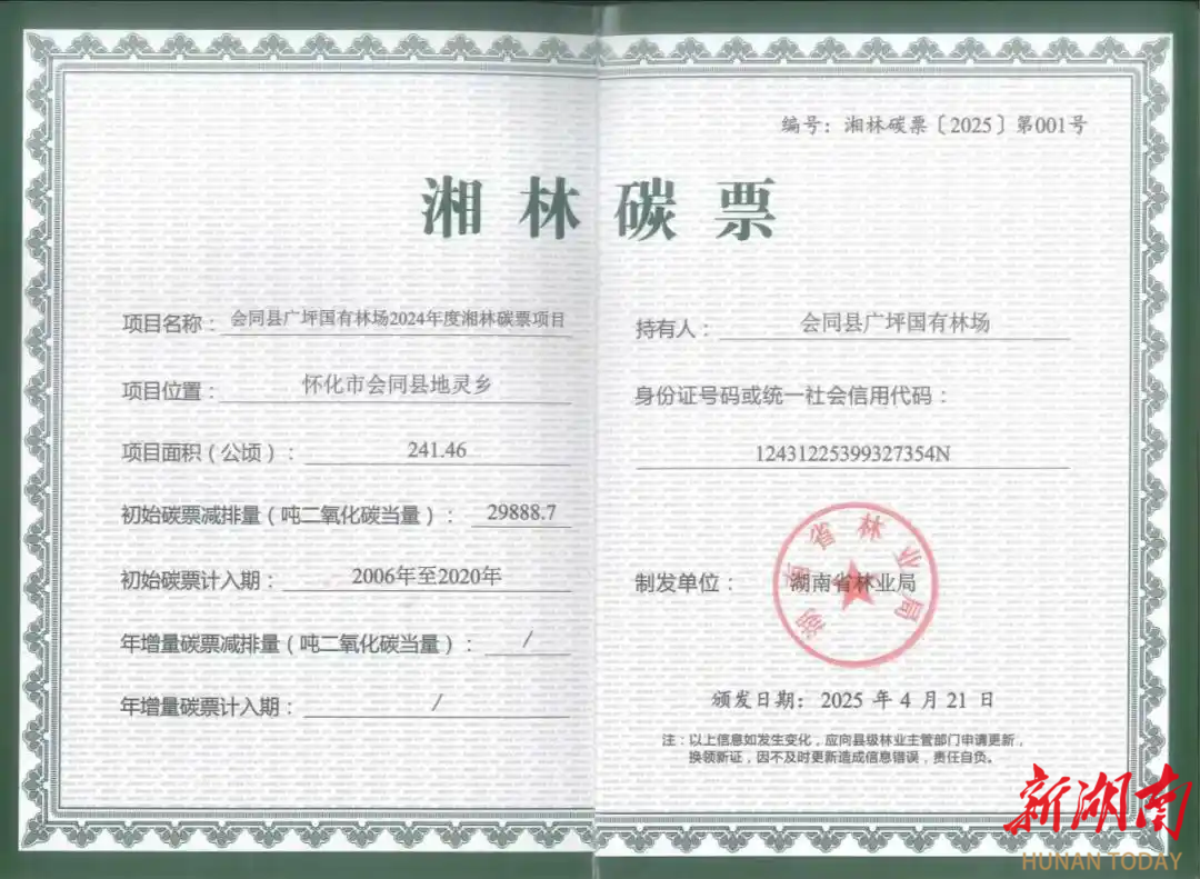 2025年4月,省林业局签发首批湘林碳票,涉及林地4405.16公顷,核定碳减排量40.78万吨二氧化碳当量,市场价值突破4000万元。