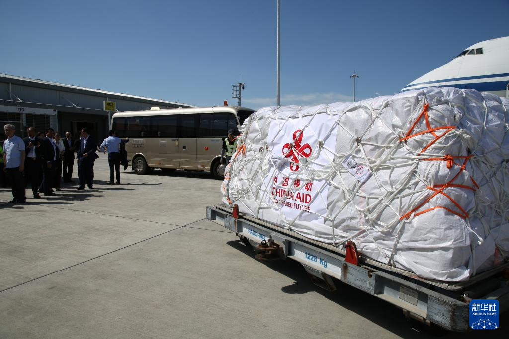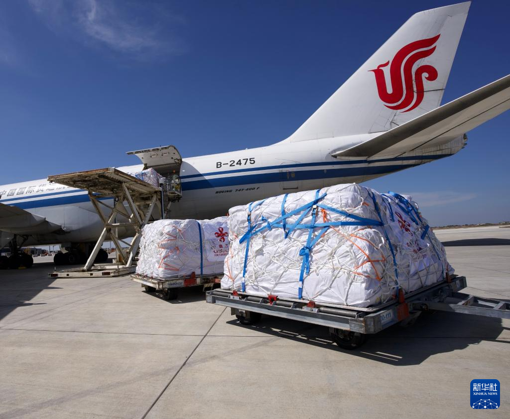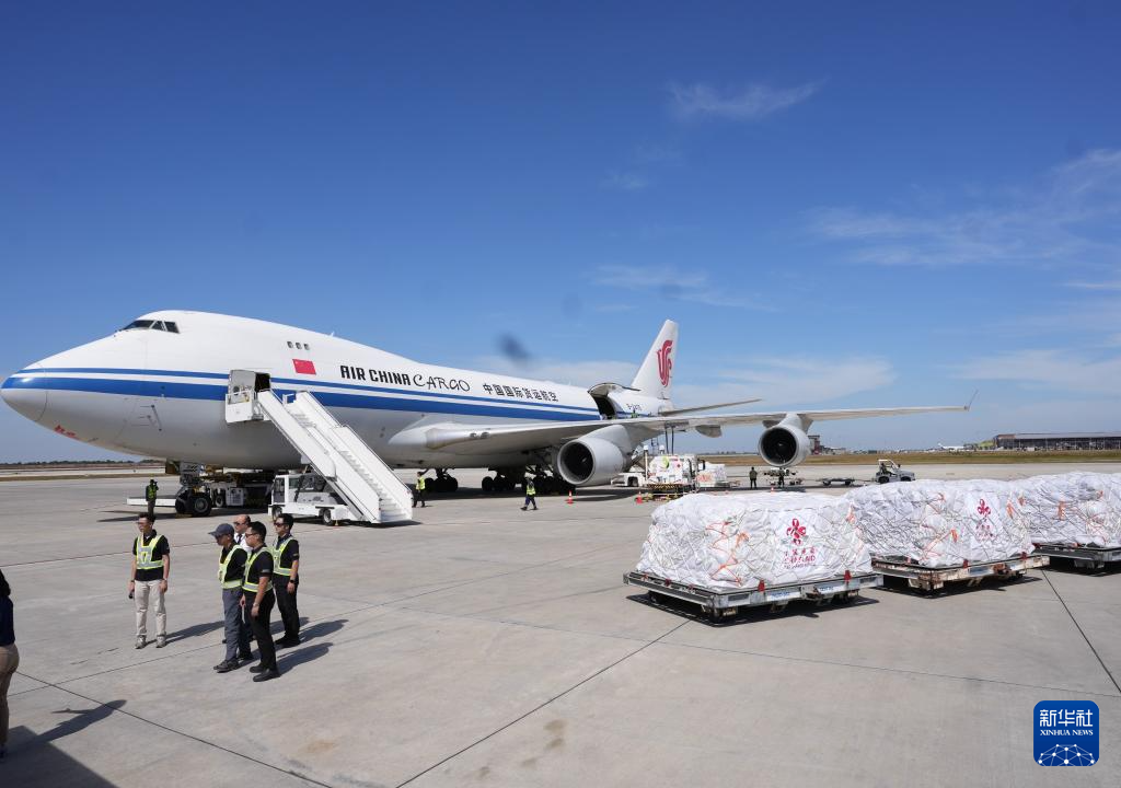 12月28日,首批中国援柬埔寨紧急人道主义物资运抵柬埔寨金边德崇国际机场。新华社发(中国驻柬埔寨大使馆供图)